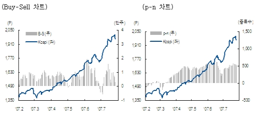그러나 2007년 2분기 이후 변동성이 확장되면서 St-Dev이 185%를 기록하여(일반적인 변동성은 30~50%수준) 극도의 가격발산이 진행되고 있다. MACD오실레이터와 DMI의 괴리도 역시 역사적 최대치를 기록하여 가격괴리에서의 중기적 부담도 크게 나타나고 있다.