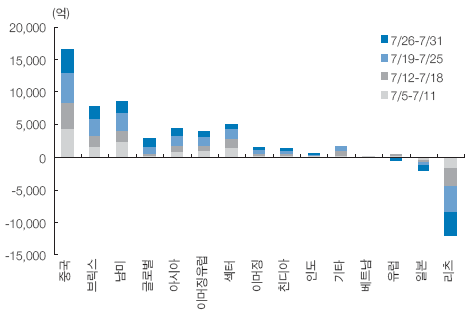 중국펀드는 지난 6월 약 8000억원이 순증가한 것을 감안하면 1조원 정도 더 유입된 셈이다. 남미펀드는 설정 후 4개월여만에 수탁액이 2조원에 육박하는 등 해외펀드의 특정지역 쏠림현상이 여전했다. 수익률이 저조한 리츠펀드와 일본펀드는 한 달새 1조5000억원에 달하는 환매가 이어졌다.