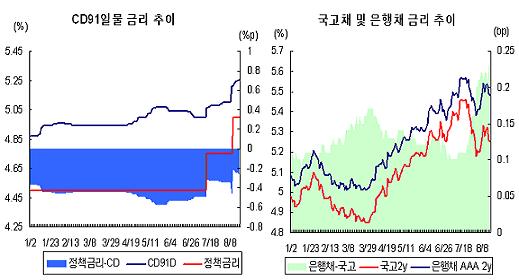 8월 콜금리 인상을 전 후로 CD91일물 금리는 5.10%에서 5.26%로 0.16%포인트 올랐다. 그러나 CD 금리가 더 오를 것으로 보인다.