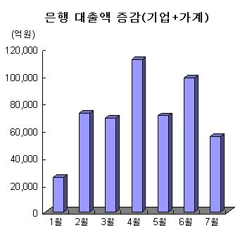 반면 은행 대출은 가계대출 증가세가 주춤했지만 중소기업 대출을 중심으로 큰 폭으로 늘었다.