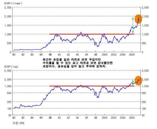 한국증시와 관련, 박 센터장은 심리적으로는 부담스럽지만 장기적인 로그차트는 최근의 폭락이 역사적으로 그렇게 우려할 만한 큰 폭의 하락이 아니라고 강조했다.