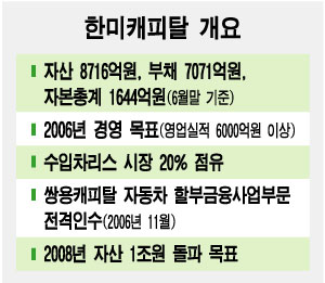 한미캐피탈은 올 6월말 현재 자산 8716억원의 중견 여신금융회사로, 지난해 11월 쌍용캐피탈의 자동차 할부금융사업부문을 인수하면서 이 부문 영업망을 크게 늘렸다. 수입차리스 시장 점유율은 20%에 이른다.