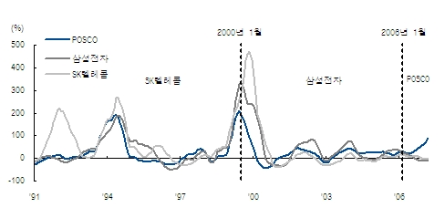 현재 극도로 상승하였던 중기 MACD오실레이터와 DMI의 괴리가 빠르게 축소되면서 적절한 Cooling 과정이 나타나고 있다. 이러한 중기 조정과정에서 주목해야 할 것은 시장의 중심축이 변화하고 있다는 것이다. 시가총액, 절대주가, 수익률 측면에서 1990년대 한국 주식시장은 SK텔레콤이 선도했으며, 2000년 이후 삼성전자가 Winner로서 위치를 이어 받았고, 2006년 이후에는 POSCO가 부상하고 있다. 이러한 시장의 질적 변화는 향후 새로운 구도의 상승흐름을 시사한다는 점에서 이번 조정이 마무리된 이후에 시장변화가 주목된다.
