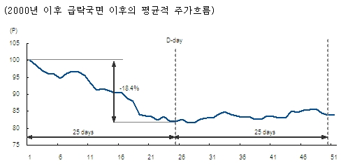 2000년 이후 평균적인 급락국면의 주가흐름을 보면, 하락세가 시작된지 25일간 18.4% 하락했으며, 이후 25일 정도 바닥확인과정을 거친 후 이전추세로 회복했다. 다시 말해서 급락 이후 최소한 1개월이상의 횡보조정국면이 진행된 것으로 나타났다.