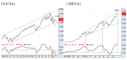 미국을 중심으로 글로벌증시도 급락 이후 반등세가 나타나고 있으나, 조정을 유발시켰던 모멘텀에 대한 검증이 점차 진행되면서 반등세가 제한될 가능성이 높아지고 있다. 미국증시(다우지수)는 2006년 2/4분기 이후 형성된 중기상승 추세대의 상단인 1만4000대에서 급락세를 보인 후 가파른 하락채널이 형성되고 있으며, 중기 지지선에서의 지지확인 이후 반등 시도가 나타나고 있다. 기술적 지표의 호전으로 단기저항선을 돌파할 경우 1차적인 저항선은 1만3700로 예상된다.