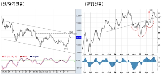원/달러 환율 역시 이러한 흐름을 공유하고 있다. 서브프라임 부실이 불거진 7월말 이후 950원까지 급등하였으나, 추세적인 절하흐름(원화상승)에는 제동이 걸리고 있다. 중기적으로 원화는 915원~950원 밴드에서 움직일 가능성이 높아 보이며, 단기적으로는 급등에 따른 반작용으로 재차 하락(원화절상)추세가 진행될 것으로 보인다.