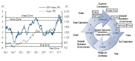 7월 이후 급락과정은 주식시장을 Cooling시켜 위험을 경고하였던 Greed & Fear Index는 Yellow Zone 아래인 중립지역으로 후퇴하였으며, Investment Clock은 과열국면을 지나 7시를 가리키고 있다.