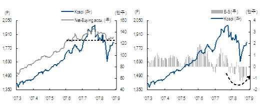 8월 중순 이후 수급구도상 안정세가 다시 확보되기 시작했다. 외국인의 매도세가 다소 둔화되는 가운데 기관의 적극적인 매수세 대응으로 7월 이후 발생했던 수급상의 균열이 상당부분 메워지고 있다.