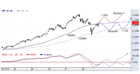 따라서 당사의 중장기 Technical View인'현재의 중기상승추세는 적어도 내년 상반기까지 이어질 것으로 예상한다'는 전망을 유지한다. 당사가 예상하는 9월의 주가 시나리오는 강세흐름으로 진행될 경우 1930선에서 저항과 60일선에서의 지지가 형성되는 강화된 횡보흐름이지만, 약세흐름으로 진행될 경우에는 120일선의 지지를 받으며(1720선) 10월초까지 기간조정에 진입하는 시나리오로 모두 9월말~10월초까지의 조정 가능성을 제시한다.