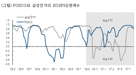 코스피와의 상관관계를 분석한 결과 지난해 하반기 이후 삼성전자와의 상관계수는 0.40인데 반하여 포스코와의 상관계수는 0.70으로, 포스코가 사실상 시장을 이끌고 있다는 판단이다. 특히 본격 상승추세로 진입한 올해 4월 이후 코스피와 포스코의 상관계수는 0.83인데 반해 삼성전자는 0.23으로 나타나 급격히 시장의 중심축이 포스코로 옮겨지고 있음을 알 수 있다.