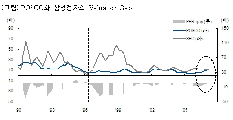 그러나 이러한 Valuation Gap은 2000년 이후 점차 축소되었으며, 결국 지난 7월 포스코의 PER이 11.9배로 상승하면서 삼성전자의 PER(10.8배)을 넘어서게 되었다. 이는 전일 사상최고치를 갱신한 포스코가 단순히 삼성전자의 주가를 넘어선 것만이 아니라 한국 주식시장에서 Winner의 Valuation 프리미엄을 받기 시작했다는 점에서 더욱 의미가 있다.