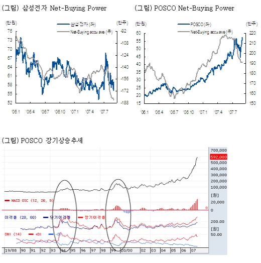 이러한 시장의 평가는 시장에너지의 집약에서도 잘 나타나고 있다. 삼성전자의 순매수에너지(Net-Buying Power)가 2006년 이후 지속적으로 감소한데 반해 포스코는 추세적으로 증가하고 있으며(최근의 감소세는 신고가 갱신에 따른 차익매도로 추정), 총에너지도 삼성전자에 비해 포스코가 꾸준히 증가하고 있다.
