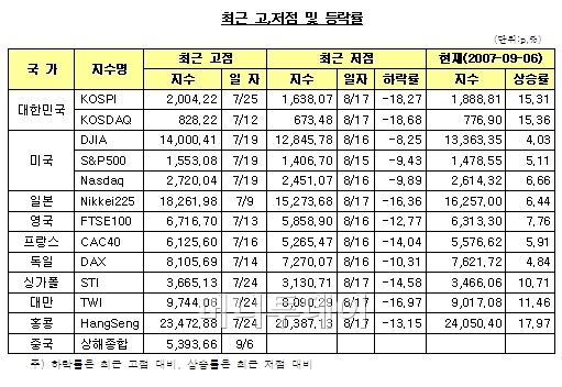 10일 증권선물거래소에 따르면 코스피지수는 미국 서브프라임 모기지 우려로 고점대비 18.27% 하락했지만 저점대비 15.31% 상승하는 회복세를 보였다.