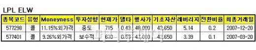 LG필립스LCD를 기초자산으로 한 콜ELW로는 '7298콜ELW'와 '7401콜ELW'를 관심종목으로 선정했다. 7298콜ELW는 행사가 4만8000원의 내가격 상태인 레버리지 5.14 수준으로, 중도 성향의 투자가 적합하다. 최종거래일은 오는 12월 20일까지다.