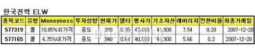 한국전력 콜ELW로는 '7319콜ELW'와 '7165콜ELW'를 투자종목으로 제시했다. 7319콜ELW는 행사가 4만7000원으로 외가격 상태이며 7165콜ELW'는 행사가 4만원으로 내가격 상태다. 두 종목 모두 중도 성향의 투자가 가능하다.