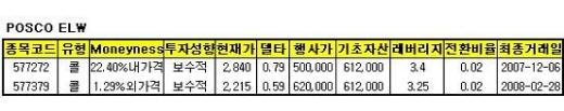 한국투자증권은 이번주(9월 17~21일) POSCO와 현대중공업의 상승이 예상됨에 따라 콜 주식워런트증권(ELW) 전략이 유효할 것이라고 17일 밝혔다.