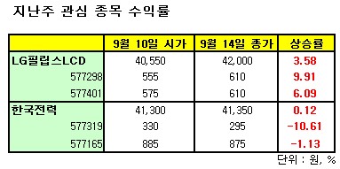 지난주 한국증권이 관심종목으로 제시한 LG필립스LCD는 한주간(9월 10~14일) 3.58% 상승했다. 이에 LG필립스LCD를 기초자산으로 한 7298콜ELW와 7401콜ELW는 각각 9.91%, 6.09% 수익률을 기록했다.