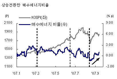 더구나 최근 매수에너지가 전체 시장에너지에서 차지하는 매수에너지비율의 경우, 지난 8월 중순 연초 이후 최저수준을 기록한 후 꾸준히 상승하여 최근에는 0% 수준을 넘어 매수세가 매도세를 능가하기 시작했다. 결국 매수에너지비율이 추세적인 상승흐름을 보였던 지난 3월~6월 수준으로 회복되어 매수세가 시장을 주도하기 시작한 것으로 판단된다.