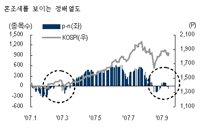 그러나 Breadth측면에서는 다소 혼조양상을 보이고 있다. 배열도가 지난 8월 중순 음전환된 직후 빠르게 회복했으나 횡보양상을 보였던 지난 1/4분기와 같이 배열도(정배열구조의 종목수 - 역배열구조 종목수)가 뚜렷한 방향성을 제시하지 못하고 있다.