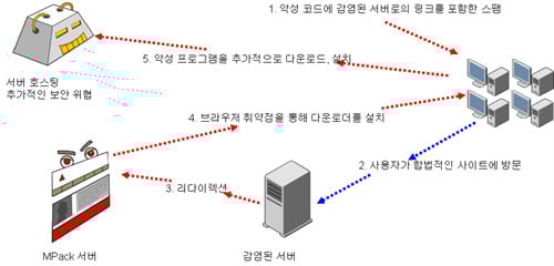 단계별 다운로더가 대표적이다. 먼저 방화벽이나 침입탐지시스템 등 보안기술을 우회하기 위해 이용자 PC에 가벼운 다운로더만 설치한 뒤 이 다운로드가 다른 웹사이트에 자동접속해 또다른 추가 악성코드를 받아오는 구조다.