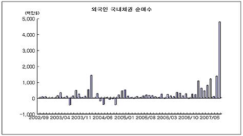 9월에도 외국인들은 8월보다 더 많은 채권을 매수한 것으로 집계됐다. 서브프라임 사태로 확대된 재정거래 기회를 외국인은 만끽했고, 외화차입규제는 외국인의 채권 매수를 통한 이익 획득의 기회를 확대하고 있다.