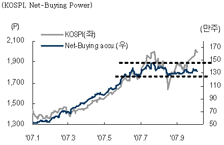 현재 코스피의 매수에너지는 생각보다 그리 강한 상황이 아니다. 지난 7월말 이후 조정과정에서 순매수에너지를 나타내는 Net - Buying Power가 하방경직성을 보이면서 코스피의 하락추세 전환이 쉽지 않을 것임을 시사했지만, 현재는 지수가 전고점을 돌파하는 상황에서 Net - Buying Power가 추세적으로 증가하지 않고 있다. 이는 수급구도가 개선되고 있음에도 불구하고 시장에너지가 상대적으로 약하다는 것을 시사한다.