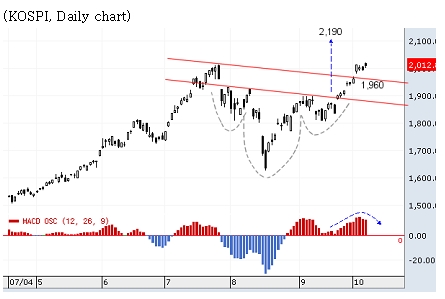 한편 수급상의 변화와 시장에너지의 개선이 이어진다면 코스피는 패턴분석상 단기적으로 2190 수준까지 상승이 예상된다. Reverse Head & Shoulder패턴의 네크라인을 차례로 돌파하면서 상승하고 있는 지수는 확장된 저항선 1960선이 향후 의미있는 단기지지선이 될 것으로 보인다.