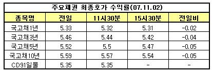 -주식시장 조정 이어질 경우 다음주도 추가 강세 가능..국채 입찰물량도 많지 않고 통안만기 3조5000억원 감안시 수급은 우호적일 듯.