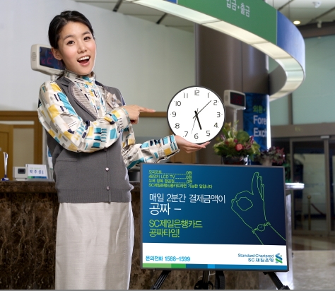 SC제일은행은 오는 19일부터 올해 말까지 SC제일은행 신용카드를 사용한 고객에게 매일 2분을 ‘공짜타임’으로 지정, 그 시간에 신용카드를 사용한 고객의 매출액을 500만원 한도 내에서 전액 돌려주는 '공짜타임' 서비스를 실시한다.