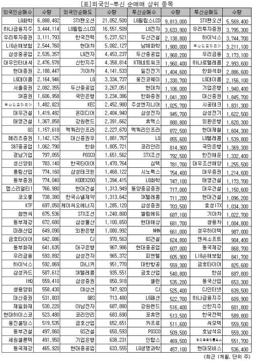 외국인이 사들인 종목은 증권주를 중심으로 한 금융주로 압축됐다. LG화학을 700만주 가까이 순매수한 외국인은 하나금융지주(344만주)와 우리투자증권(311만주), LIG손해보험(254만주), 현대증권(218만주), 서울증권(208만주) 등을 집중적으로 사들였다. 중국 관련주 가운데 두산인프라코어도 148만주 순매수했다.
