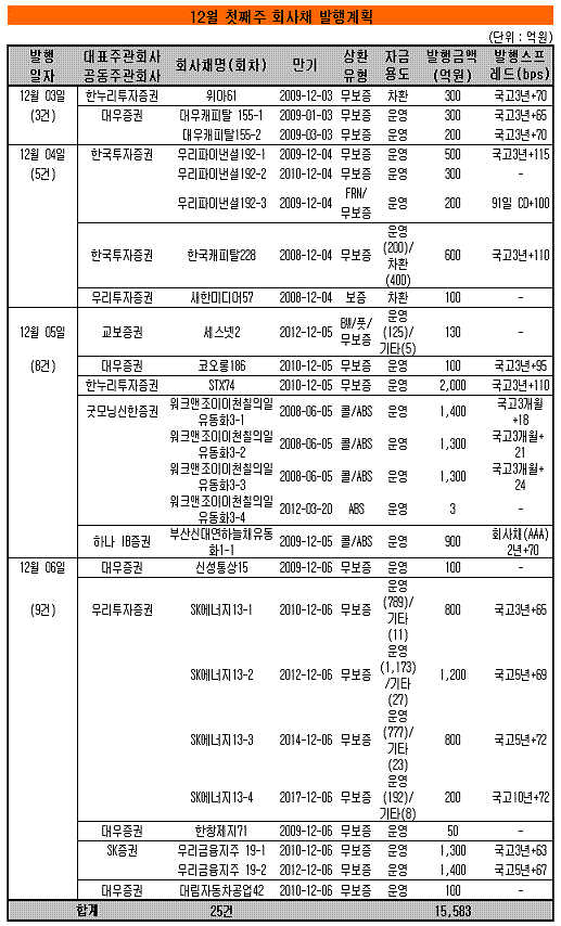 12월 첫째주(12.3~7) 발행 예정인 회사채는 총 25건, 1조5583억원으로 집계됐다. 지난주보다 발행 건수는 1건 감소했지만 금액은 6997억원 증가했다. 자금용도는 운영자금 1조4709억원, 차환자금 800억원 및 기타가 74억원이다. ↑자료, 증권업협회 독자들의 PICK! '아들 불륜' 조갑경 예능 출연에 전며느리 분노..."난 고통 속에 사는데" 의사 남편 외도 봐줬더니 또…"상간녀 위자료도 대신 내" '은퇴' 조진웅, 말레이시아 목격담…4개월 만에 알려진 근황 "총각인 줄 알고 결혼" 빚더미 남편, 전처·자식 숨겼다...아내 충격