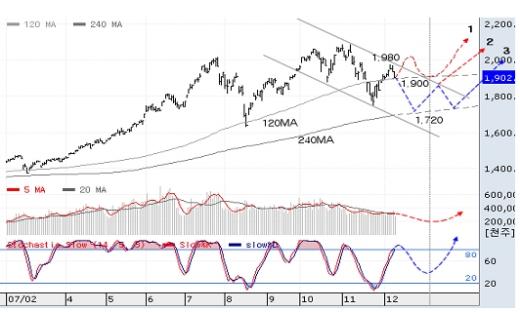 현재 코스피는 추세대의 상단(1980)에서 저항을 받은 후 120일선상에서 지지력을 테스트 받고 있다. 만약 1900선에 위치한 120일선이 붕괴된다면, 다음 지지선은 1800선이다(중기 지지선은 240일선이 위치한 1720). 만약 거래량이 증가하면서 1900선에서 지지가 확보된다면 최소한 1900~1980의 단기횡보국면을 예상할 수 있다. 결국 구름대의 하단이자, 120일선이 위치한 1900의 지지여부가 연말장세를 결정지을 것으로 보인다.