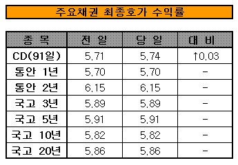 증권업협회에 따르면 장마감 기준으로 고시한 3년, 5년 만기 국고채 수익률은 각각 전일대비 전일비 보합인 5.89%, 5.91%를 기록했다.