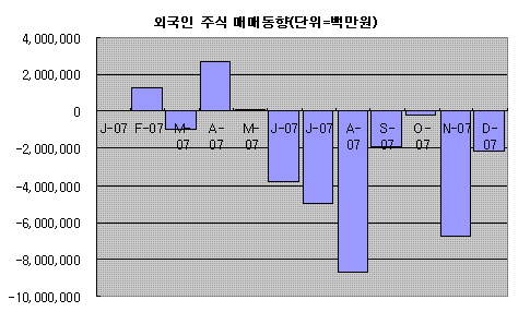 서브프라임 모기지 사태가 크게 부각됐던 8월 8조6977억원어치를 순매도했고 11월 들어서도 6조7406억원어치 순매도를 기록했다. 이달 들어서도 20일까지 2조1568억원어치를 순수하게 팔고 있다.