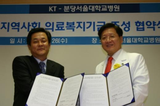 KT와 분당서울대학교병원은 26일 지역사회 소외계층 대상 의료 복지증진을 위한 공동기금 조성 및 양사 자원봉사 인프라를 활용한 공동 자원 봉사활동 수행을 위한 협약을 체결했다.