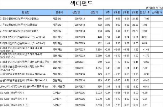 반면 섹터펀드 중 산은자산운용의 산은S&P글로벌클린에너지주식자ClassC1은 7.63%하락하며 크게 부진했다.