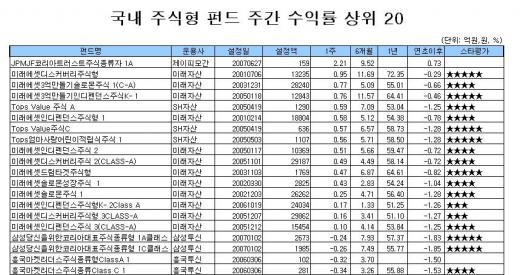 모닝스타코리아는 설정 후 6개월 이상 경과됐고 설정액이 100억원 이상인 펀드 중 연초이후 수익률 상위펀드를 국내 대표 주식형펀드로 분류하고 있다.