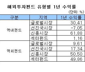 신흥시장의 경우 대부분 부진한 가운데 인도펀드가 상대적인 우위를 나타냈다. 한국과 중국,인도에 투자하는 미래에셋자산운용의 미래에셋KorChindia포커스7주식 1(CLASS C-I)이 2.02% 로 가장 좋은 수익을 냈고, 템플턴투신운용의 프랭클린인디아플러스주식형자도 0.34%의 수익을 올렸다. 그러나 나머지 대부분의 펀드는 수익률이 하락했고 미래에셋인디아솔로몬주식 1종류A도 1.9%손실을 나타냈다.
