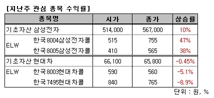 이에 따라 삼성전자를 기초자산으로 한 8004콜ELW와 8005콜ELW는 각각 47%, 38% 수익률을 기록했다. 반면 현대차를 기초자산으로 한 8003콜ELW와 7495콜ELW는 각각 5.1%, 8.9% 하락했다.