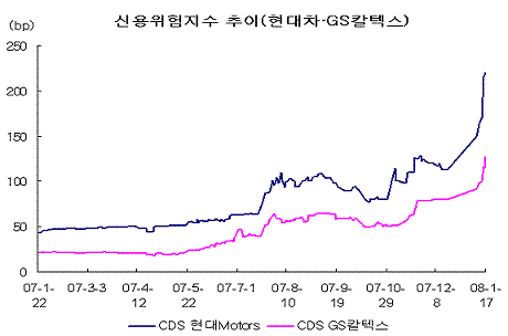 일반 기업 가운데는 신용등급이 BBB-(S&P)이 낮은현대자동차(469,000원 ▼2,000 -0.42%)의 CDS 프리미엄이 수직 상승하고 있다. 현대자동차는 17일 현재 2.20%포인트를 기록해 지난해 말보다 1.00%포인트 올랐다.