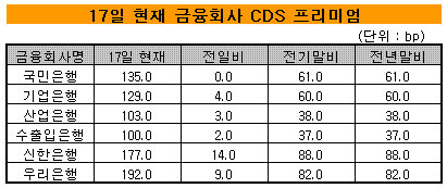 국내 금융기관 가운데는 우리은행의 CDS 프리미엄이 지난 17일 1.92%포인트까지 상승해 가장 높은 수준을 기록했다. 주요 해외 IB들이 서브프라임 모기지 자산 투자로 손실을 기록한 가운데 우리은행도 서브프라임 자산에 투자한 점이 다른 은행에 비해 높은 CDS 프리미엄으로 연결됐다는 지적이다.