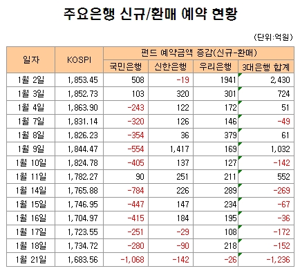 반면 올들어 연일 순 펀드 예약금액이 플러스(+)를 보였던 신한은행의 경우 17일부터 환매우위로 돌아섰다. 우리은행은 새해 첫날 무려 1941억원의 신규우위를 기록하는 등 21일 전까지는 환매금액보다 신규금액이 100억원 이상 많았다. 펀드환매 신청 후 자금유출까지 3~4일 걸린다는 점을 감안할 때 우리은행도 지난주 중반부터 환매예약이 우위를 보이기 시작한 것으로 추정된다.