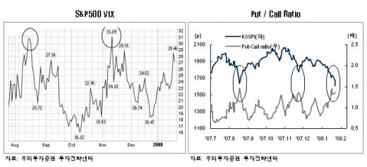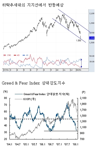 문제는 최근의 하락세가 어디까지 지속될 것인가 하는 것이다. 시장관점에서 보면 2008년 들어 본격화된 하락세는 이제 과매도국면의 마무리 단계에 진입했다고 판단된다. 즉, 극단적인 과매도가 발산하는 Selling Climax의 조짐이 관찰되기 시작했다. 더구나 2003년 이후의 장기 상승추세선이 위치한 1,600p선상에서 여러 시장지표들이 발산함에 따라 Selling Climax의 가능성은 더욱 높아지고 있다.