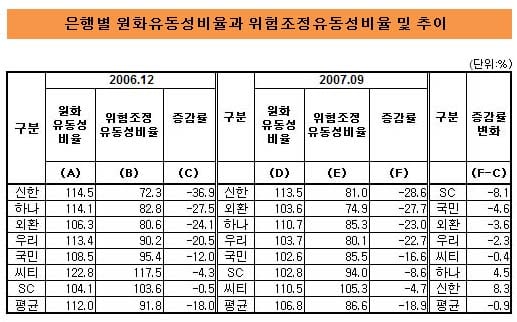 특히 2006년말 대비 2007년9월말의 원화유동성비율 대비 위험조정유동성비율을 계산한 결과 SC제일, 국민, 외환, 우리은행 순으로 하락률이 컸다.업계의 자금조달구조 변화가 빠르게 일어났던 2007년 중 이들 은행의 실질적 유동성 위험의 상승 정도가 두드러졌던 것으로 해석할 수 있다.