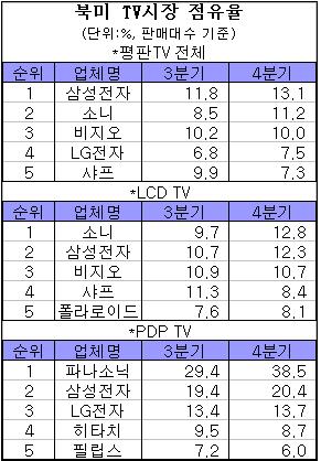 세계 최대 규모인 북미 LCD TV시장에서 삼성전자가 지난해 4분기 대폭적인 판매대수 향상에도 불구하고 일본 소니의 급성장에 밀려 근소한 차이로 수위 자리를 놓쳤다.