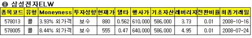 삼성전자를 기초자산으로 한 콜ELW로는 8013콜ELW와 8005콜ELW를 투자종목으로 선정했다.각각 행사가 61만원 64만원인 외가격 상태로, 보수적인 투자가 가능하다고 한국증권은 소개했다.