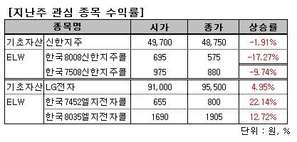 반면 한국증권이 추천한LG전자(112,000원 ▼1,000 -0.88%)는 한주간 4.95% 올라 LG전자를 기초자산으로 한 7452콜ELW와 8035콜ELW는 각각 22.14%, 12.72% 상승했다.