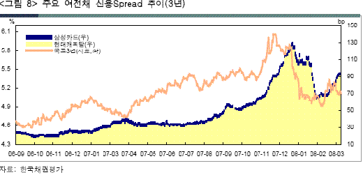 여전채의 금리 스프레드가 확대되면서 투자 뿐 아니라 발행이 더욱 신중해지고 있다. 이는 같은 금융채중 우량한 은행채 발행이 크게 늘어난 결과다. 대규모 만기도래에 의한 것.