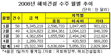 월별로는 지난 1월 58건의 공사를 통해 53억4521만9000달러를 따낸데 이어 2월과 3월에는 각각 43억2482만3000달러(49건)와 43억6265만4000달러(38건)를 수주했다. 이달들어선 이날 현재까지 3건 공사에서 12억8970만3000달러의 해외공사를 확보했다.