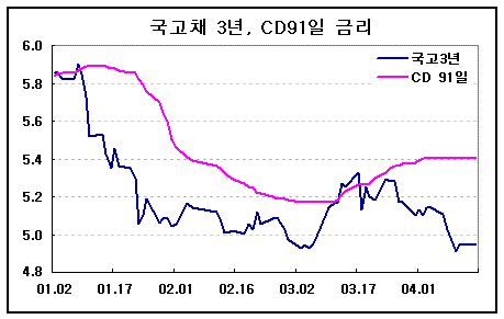 국고채 3년물 금리가 지난 4일 고점이었던 5.14% 이후 무려 0.2%포인트나 하락한 것에 비해 CD금리는 5.40%에서 제자리 걸음을 하고 있다.